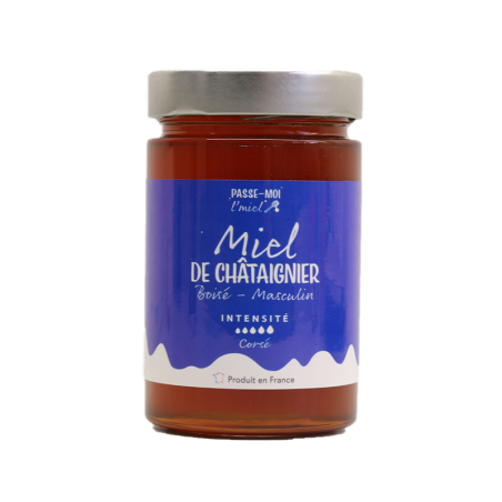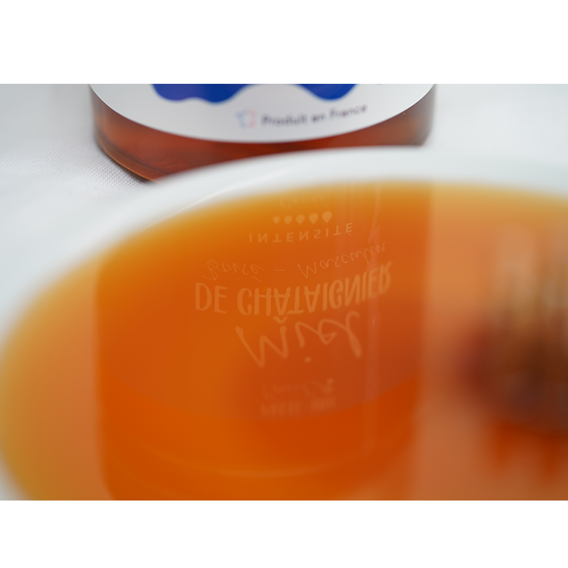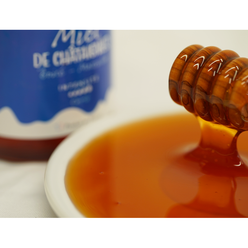 NOTRE MIEL DE CHÂTAIGNIER est intense, corsé, boisé, aux notes caramel. Explosif et long en bouche. Sensations fortes garanties !